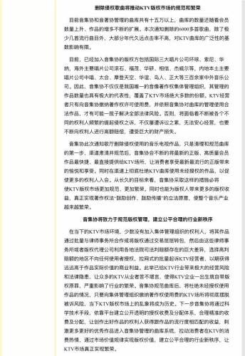 客户端11月5日电(记者 张曦) 近日,中国音像著作权集体管理协会向(以下简称“音集协”)要求全国KTV下架6000多首歌曲引发热议。今天音集协通过官网回应称,这6000多首歌曲,除了极少几首流行曲目外,大部分年代久远点击率不高,对KTV曲库的广泛性的基数影响有限。声明还提到,未来会不断的将最新正版、高质量会员作品提供给KTV。